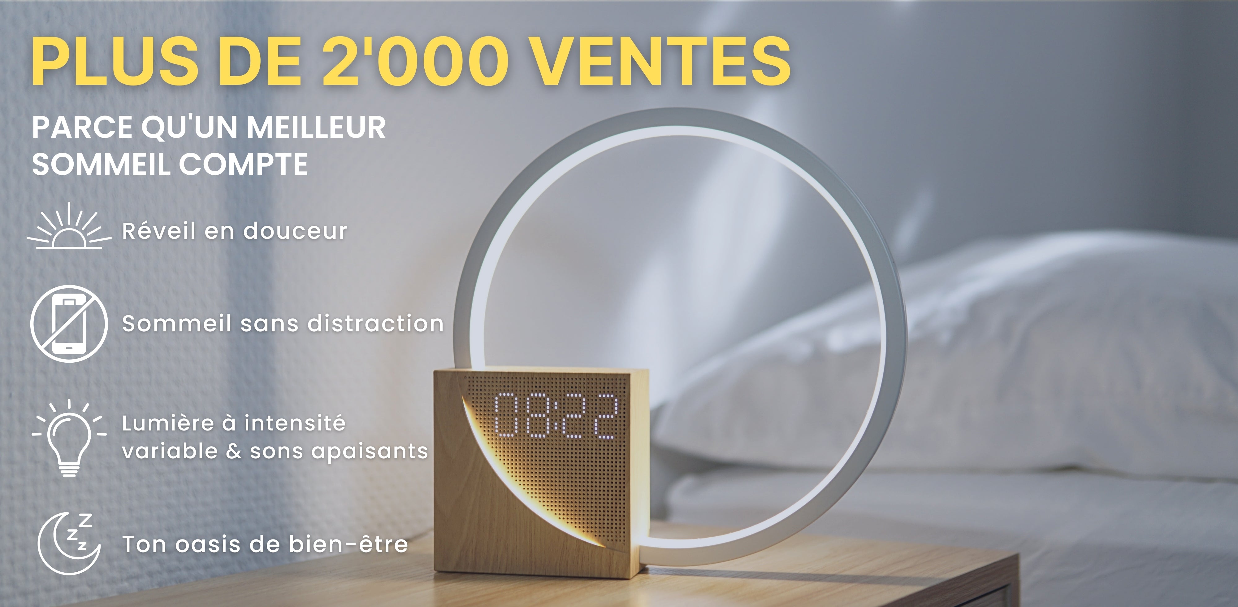 La pièce est calme, apaisée. Tu fermes les yeux, bercé par des sons doux et une vraie sensation de tranquillité.Le matin, pas de réveil brutal, mais un réveil lumineux sans ondes, qui s’allume progressivement avec une lumière chaude pour t’amener doucement dans le présent.