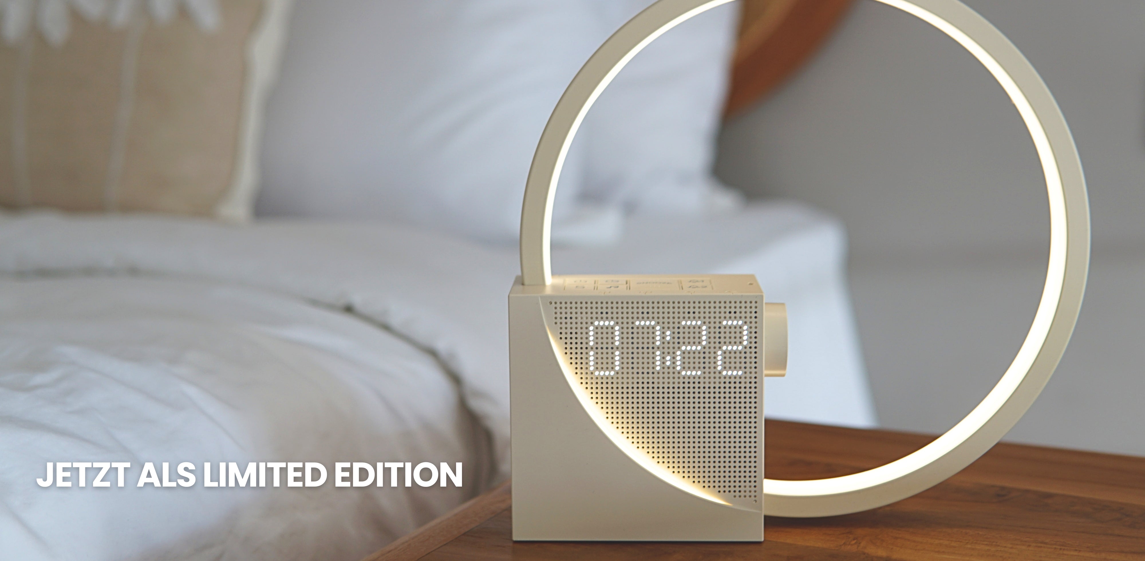 Die Limited Edition des Rise & Shine Lichtweckers verbindet exklusives Design mit smarter Funktionalität: Ein sanft heller werdendes Sonnenaufgangslicht, 10 beruhigende Naturklänge und eine 3-stufig dimmbare LED-Nachttischlampe helfen dir, deine Abendroutine bewusst zu gestalten – und morgens entspannt aufzuwachen.